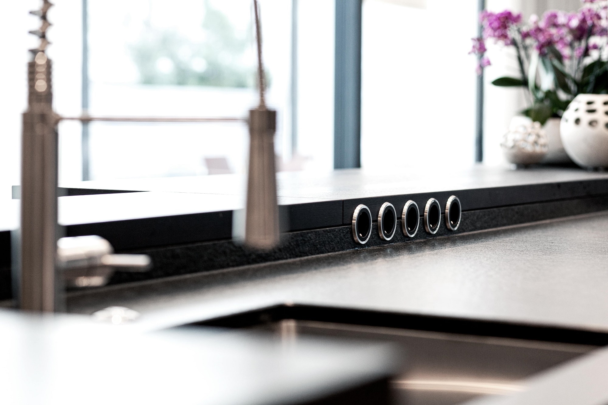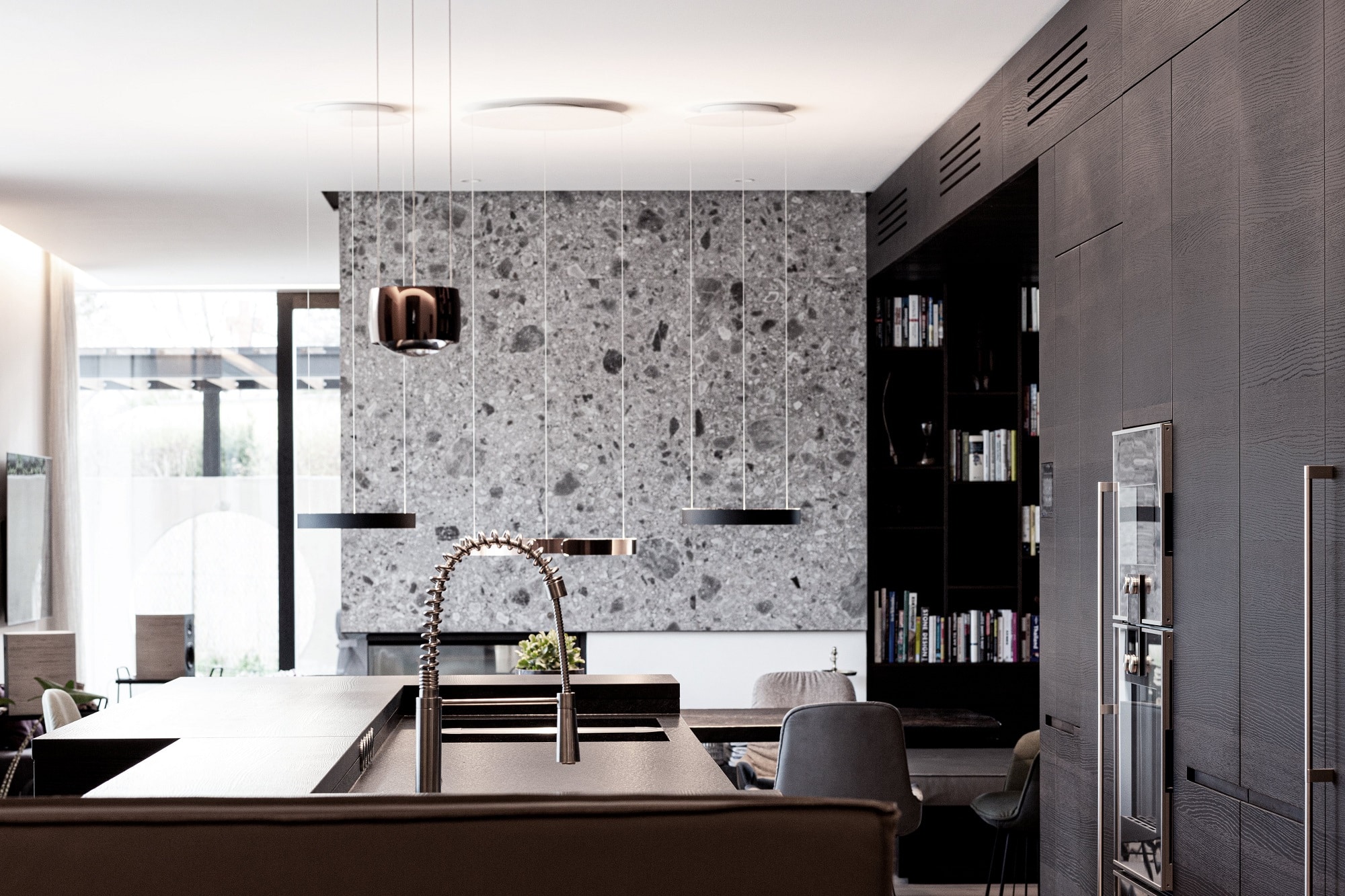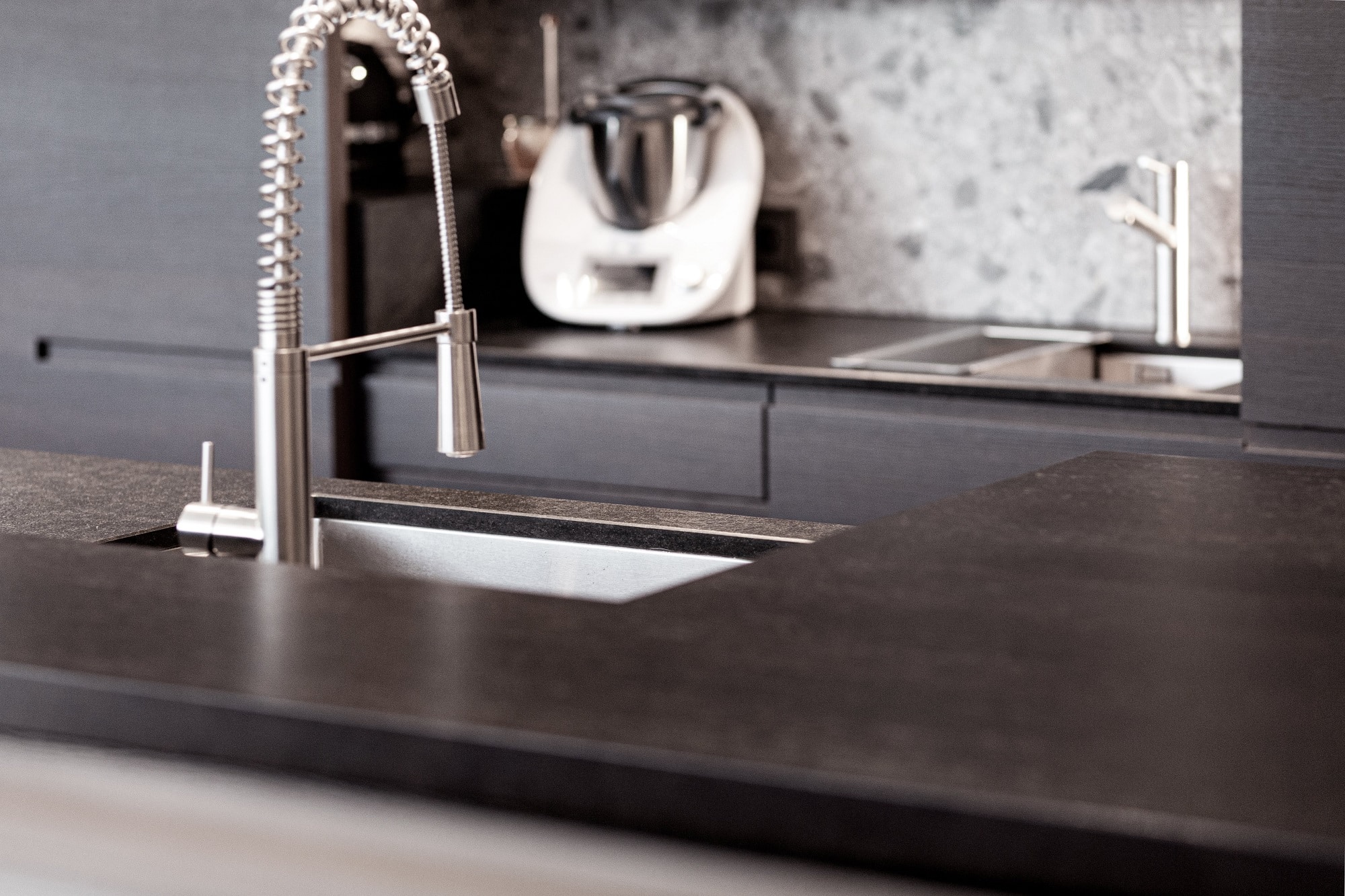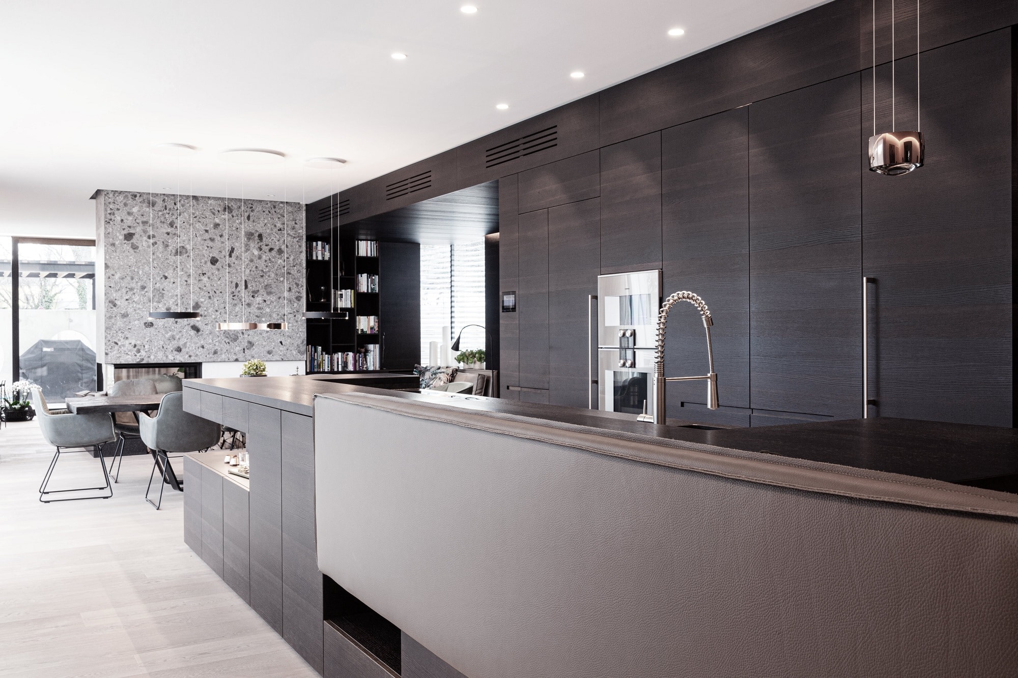 Edle Materialien und hochwertige Geräte runden diese eindrucksvolle Designküche ab.
