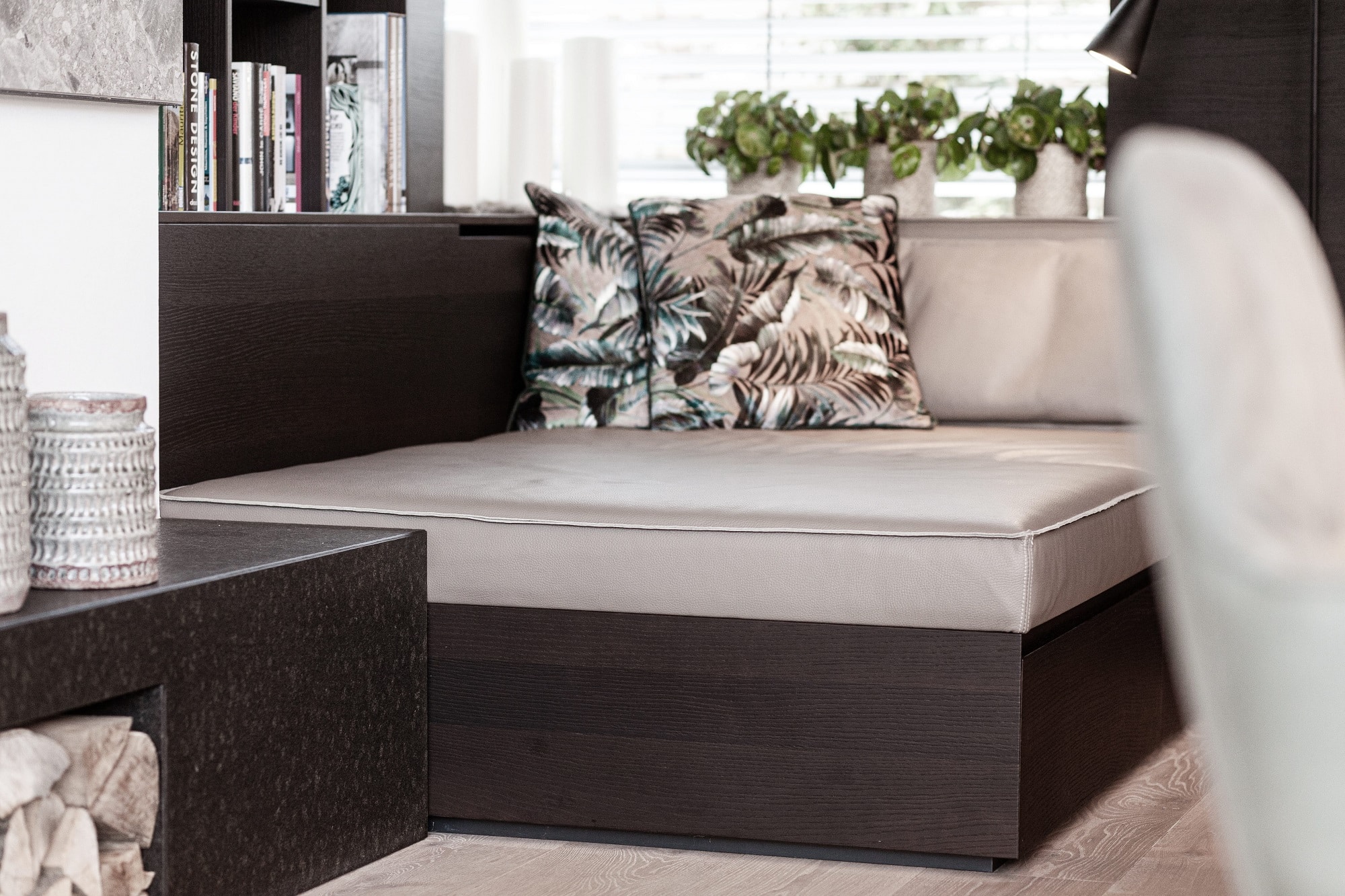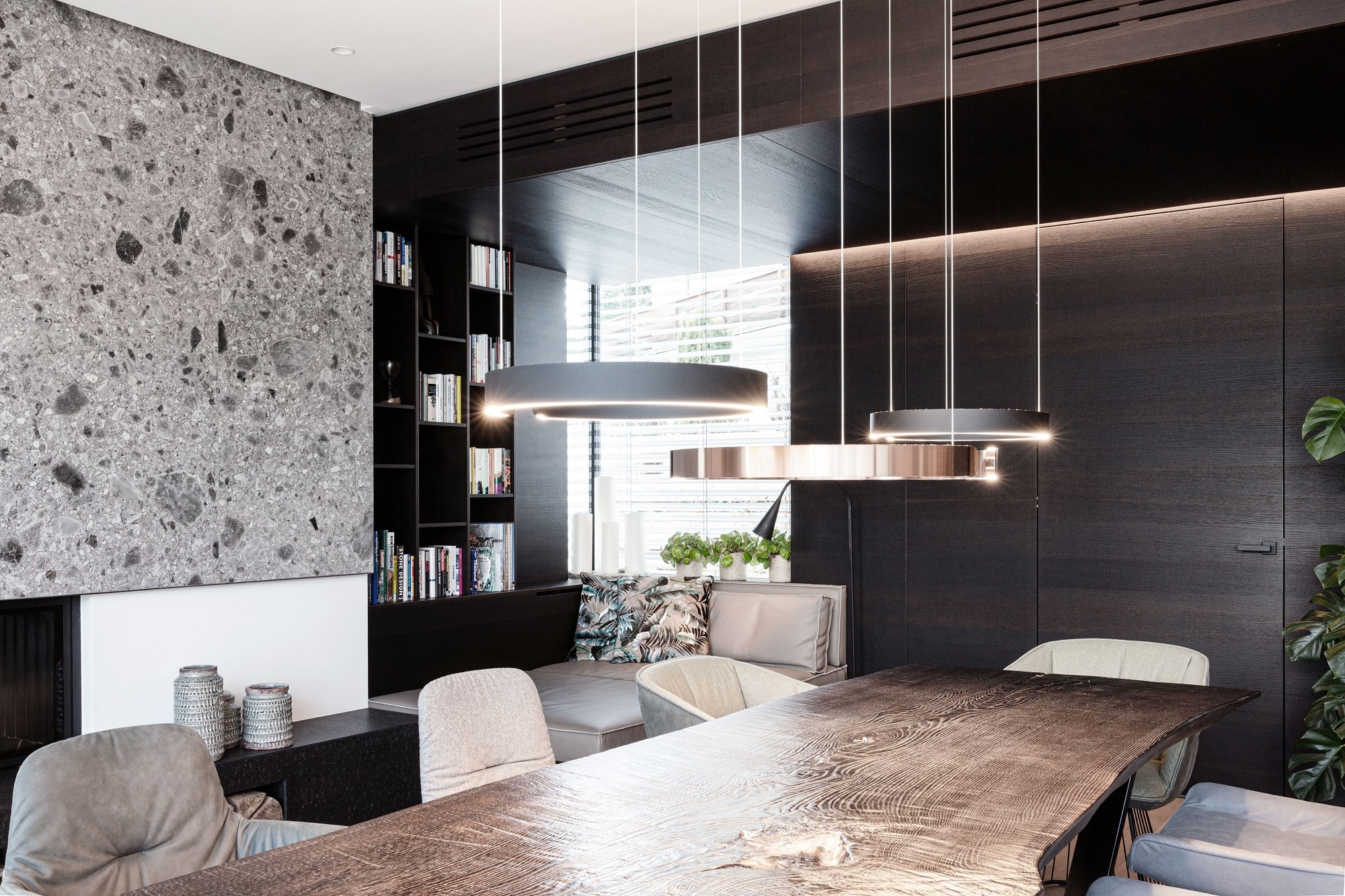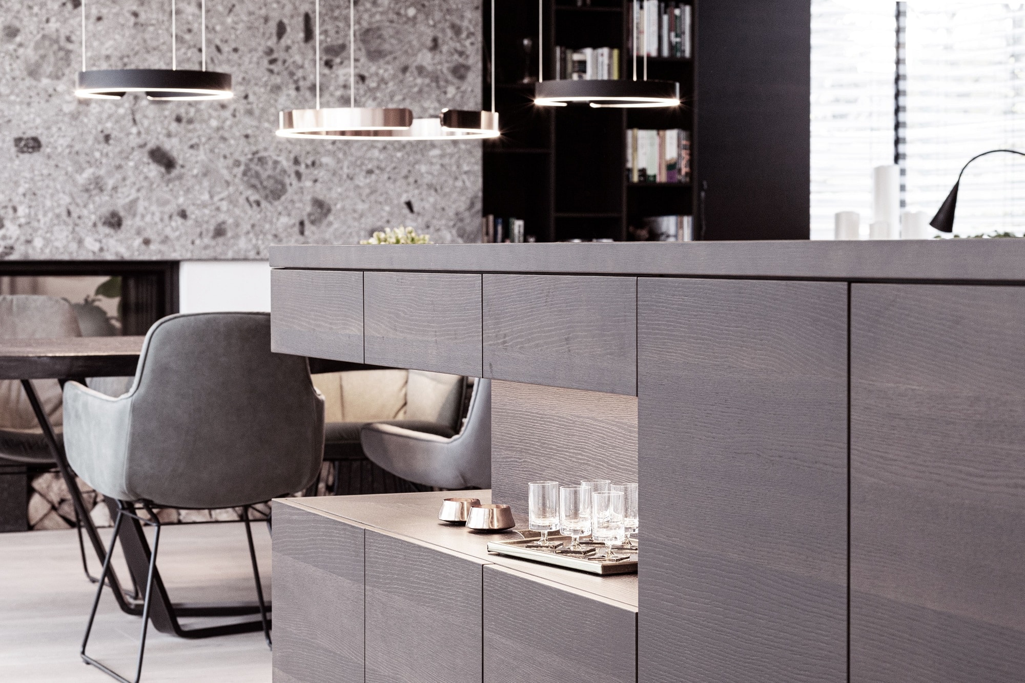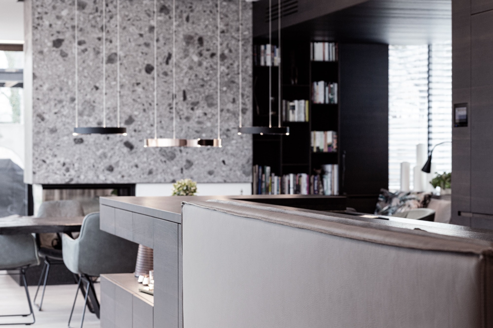 Von der Kochinsel ausgehend verschmelzen der Koch-, Ess- und Lounge Bereich zu einer Einheit. Raffiniert platzierte Details, wie der Sitzbereich bei der Kochinsel, das Schiebeelement an den Hochschränken oder wiederkehrende Nischen, fügen sich perfekt in das Raumkonzept ein.