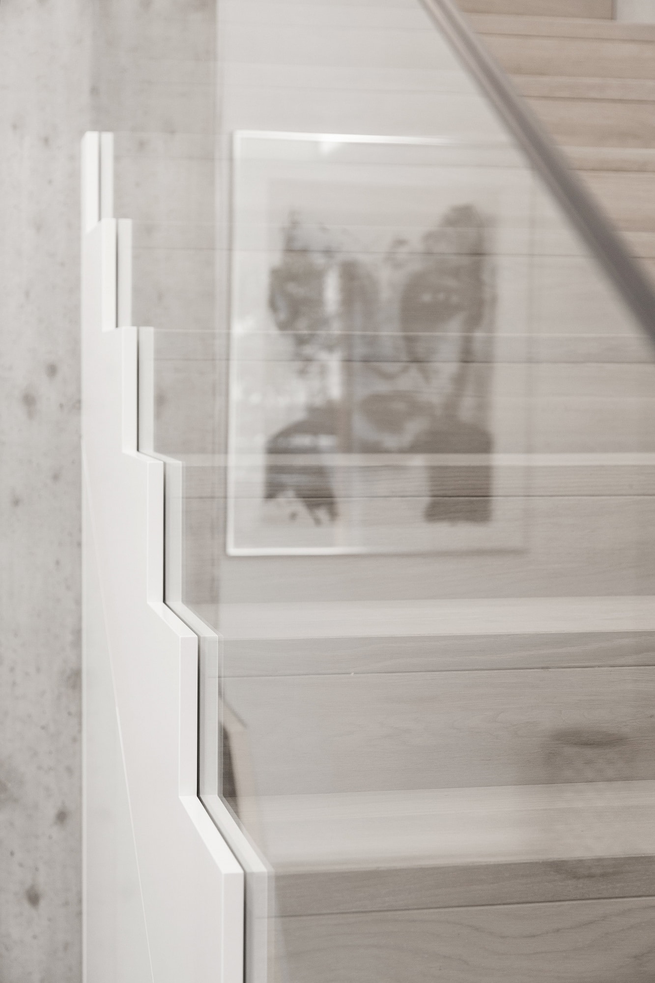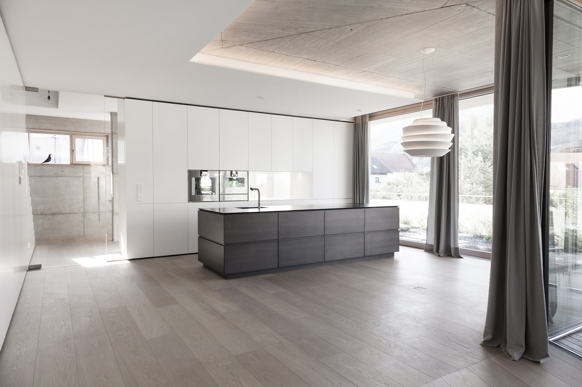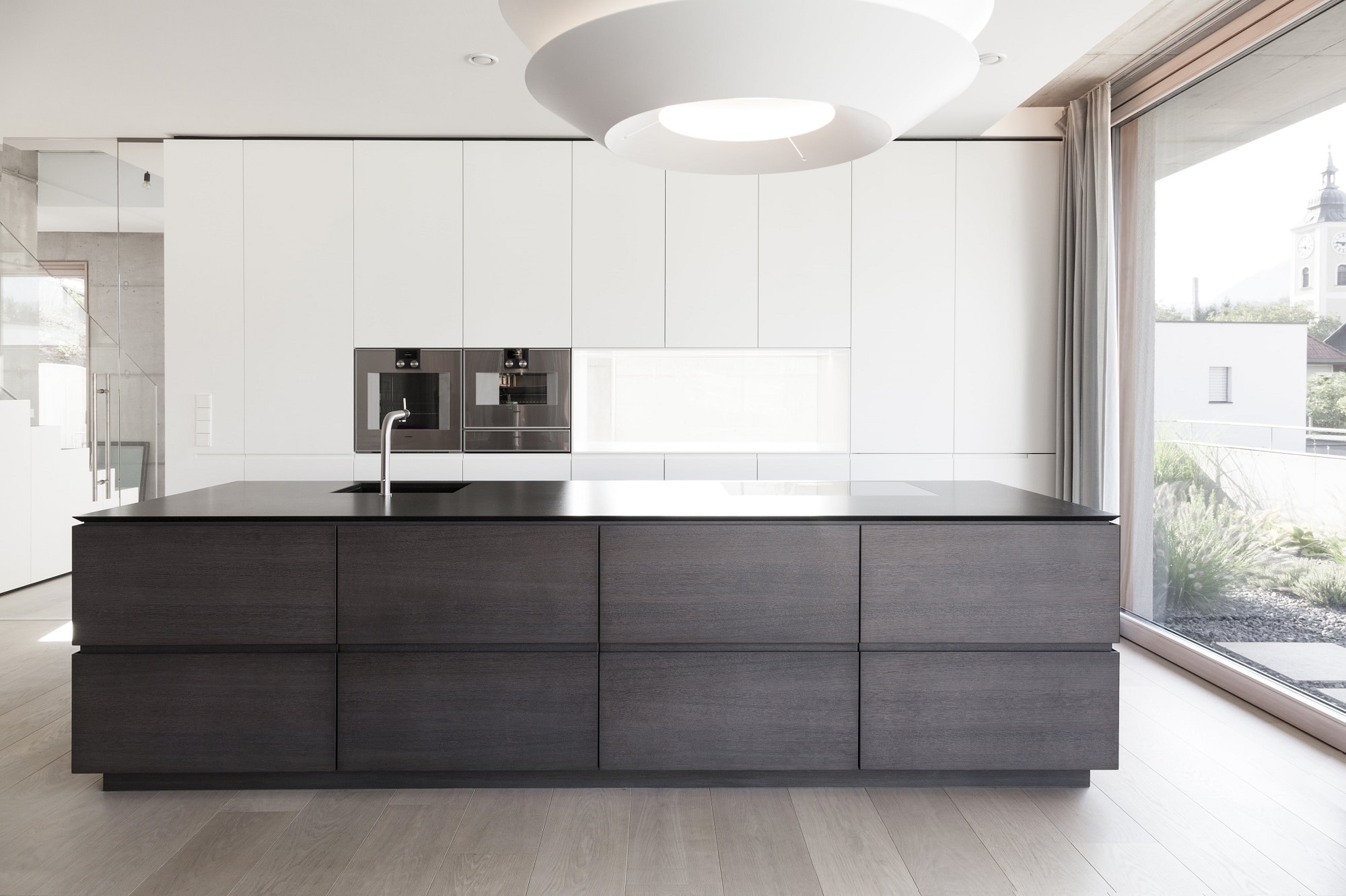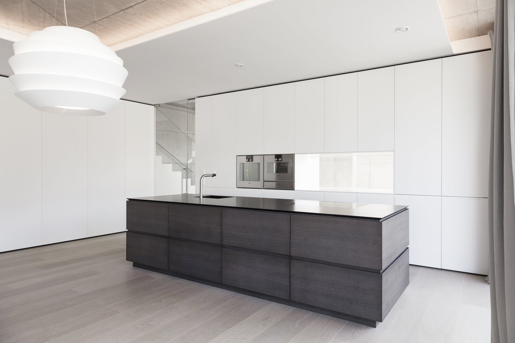 Notwendiges, wie zum Beispiel Stauraum und Geräte wurden in die Hochschränke im Hintergrund integriert. Als Gegenspieler zur weißen Oberfläche, die alles noch weiter und offener erscheinen lässt, wurde die Kochinsel in speziell gebeizter Eiche ausgeführt.