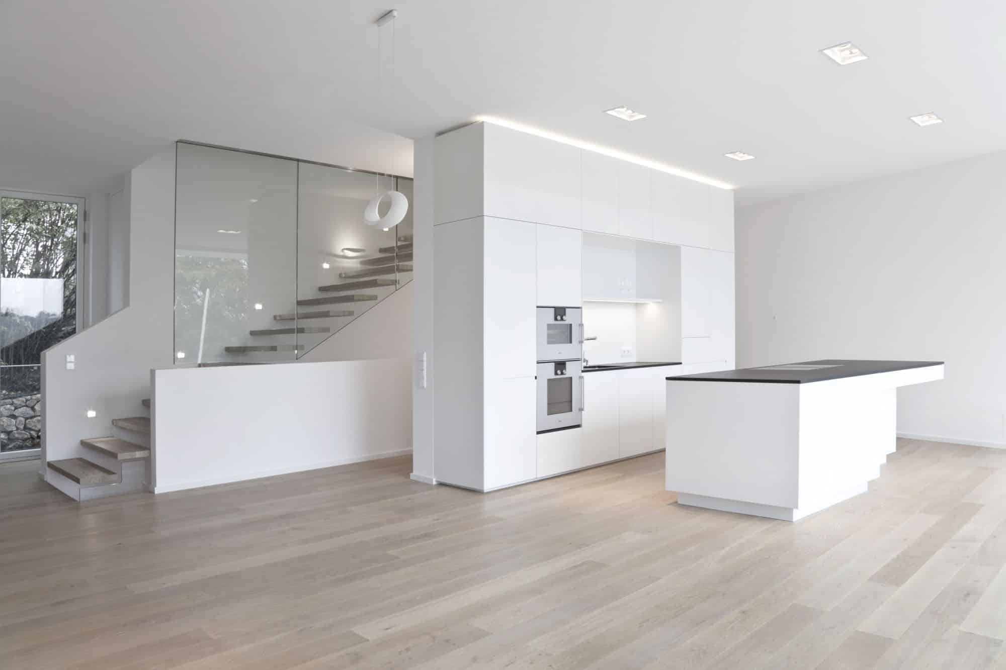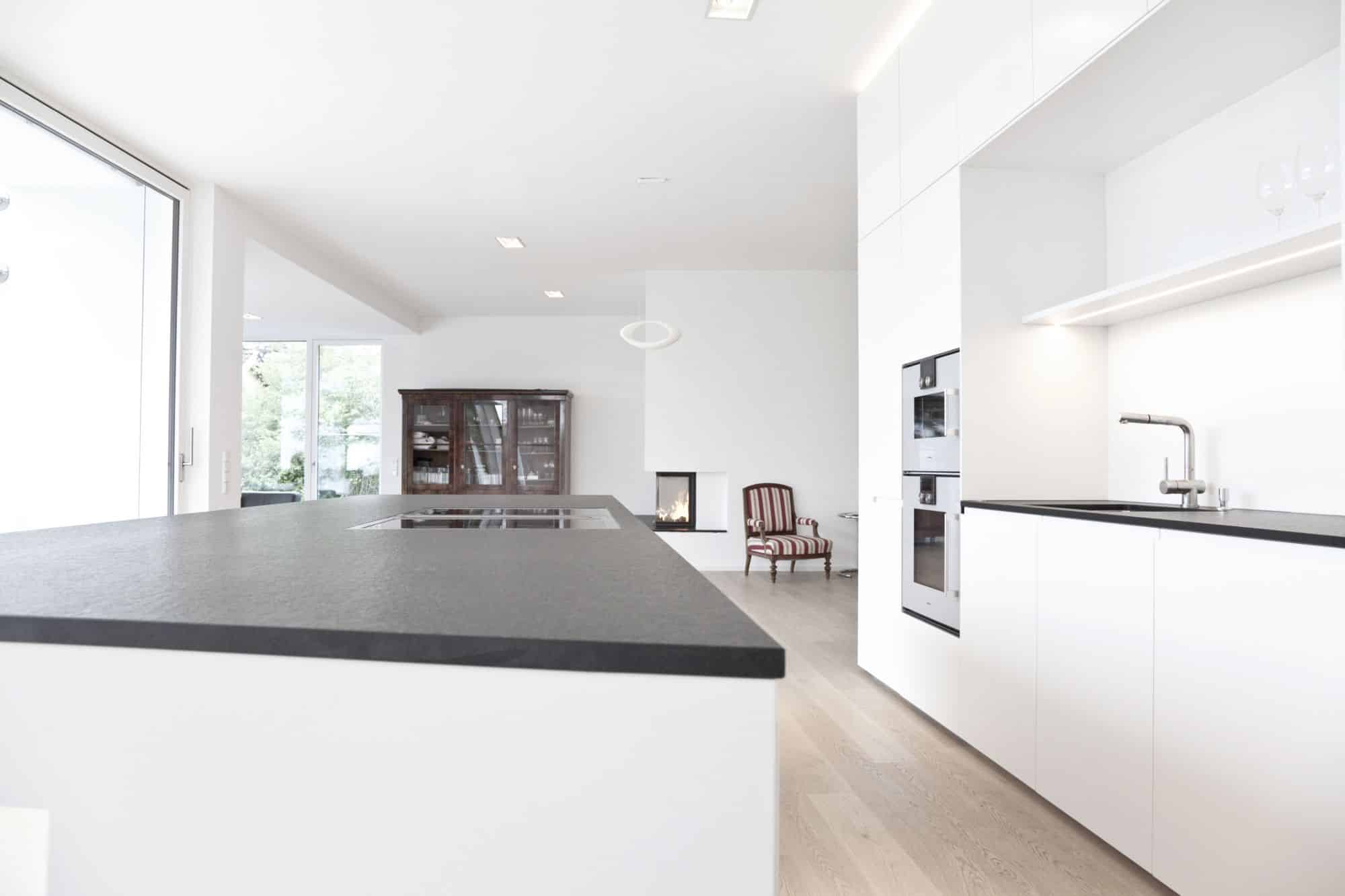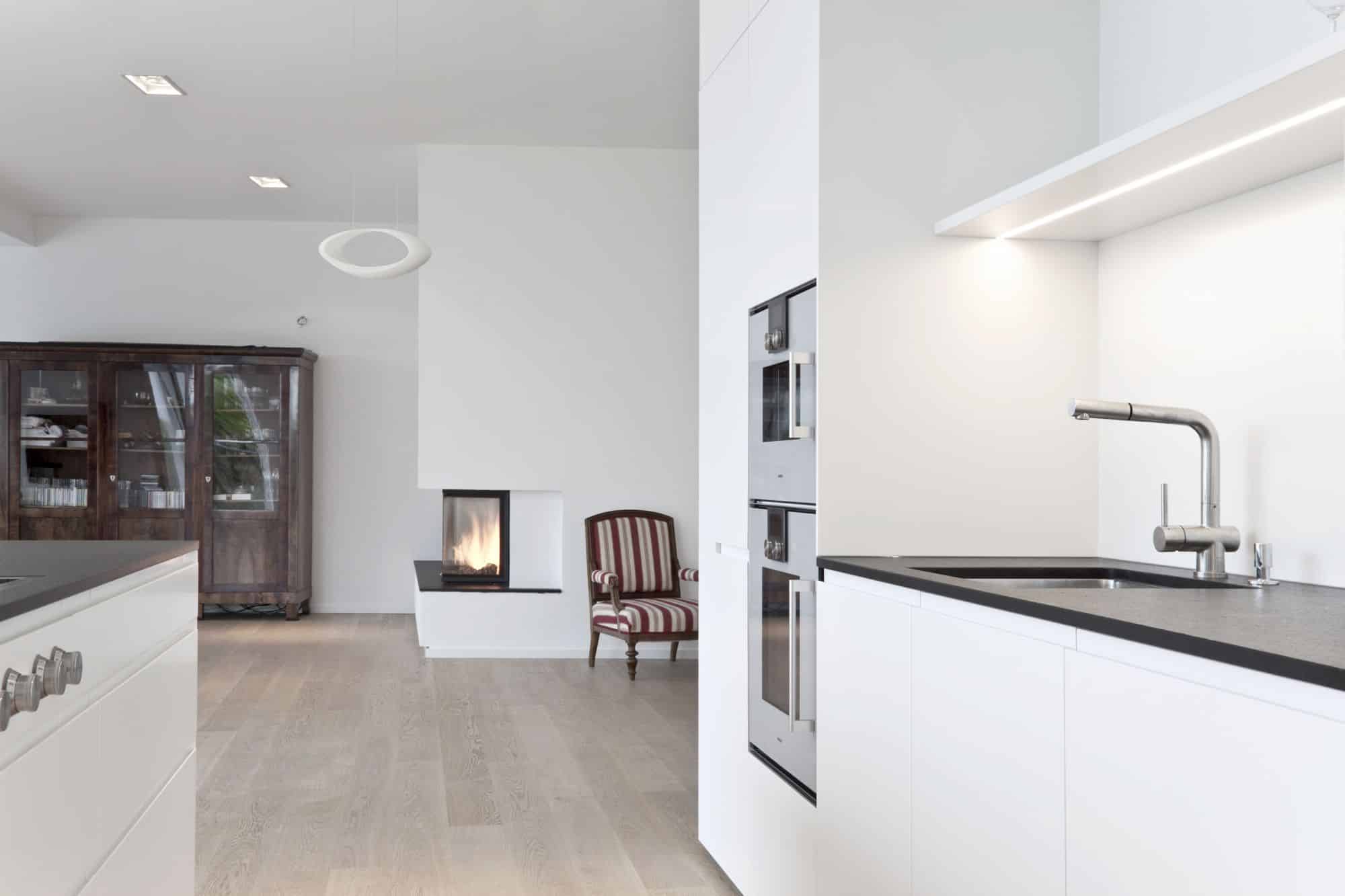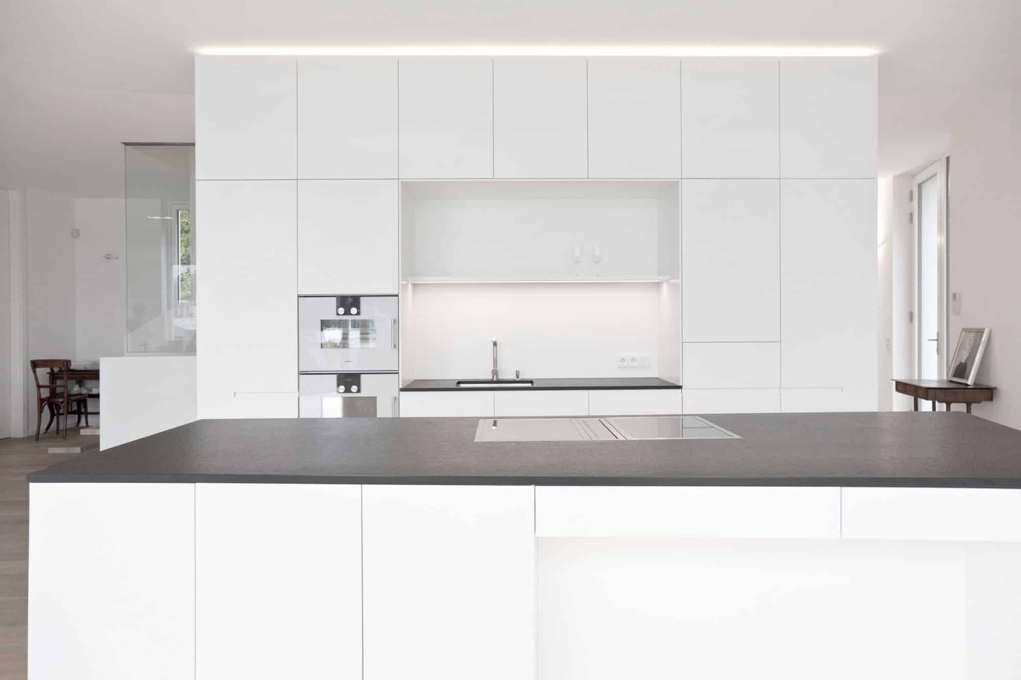 Bei diesem Projekt in Wien wurde von Innenarchitekt Georg Lehner bei der Gestaltung der Kochinsel die Form des Grundrisses aufgenommen. So fügt sich die offene Küche perfekt in die Architektur des Hauses ein, was eine optimale Nutzung des verfügbaren Raumes ermöglicht. Die Grundfarbe der Küche ist ein zeitloses Weiß, das ein Gefühl von Helligkeit und Eleganz vermittelt. Das minimalistische Interior Design unterstreicht die Exklusivität des Gesamtkonzepts. Die Küche ist mit exklusiven Gaggenau-Geräten ausgestattet, die höchsten Ansprüchen an Funktionalität und Design gerecht werden.