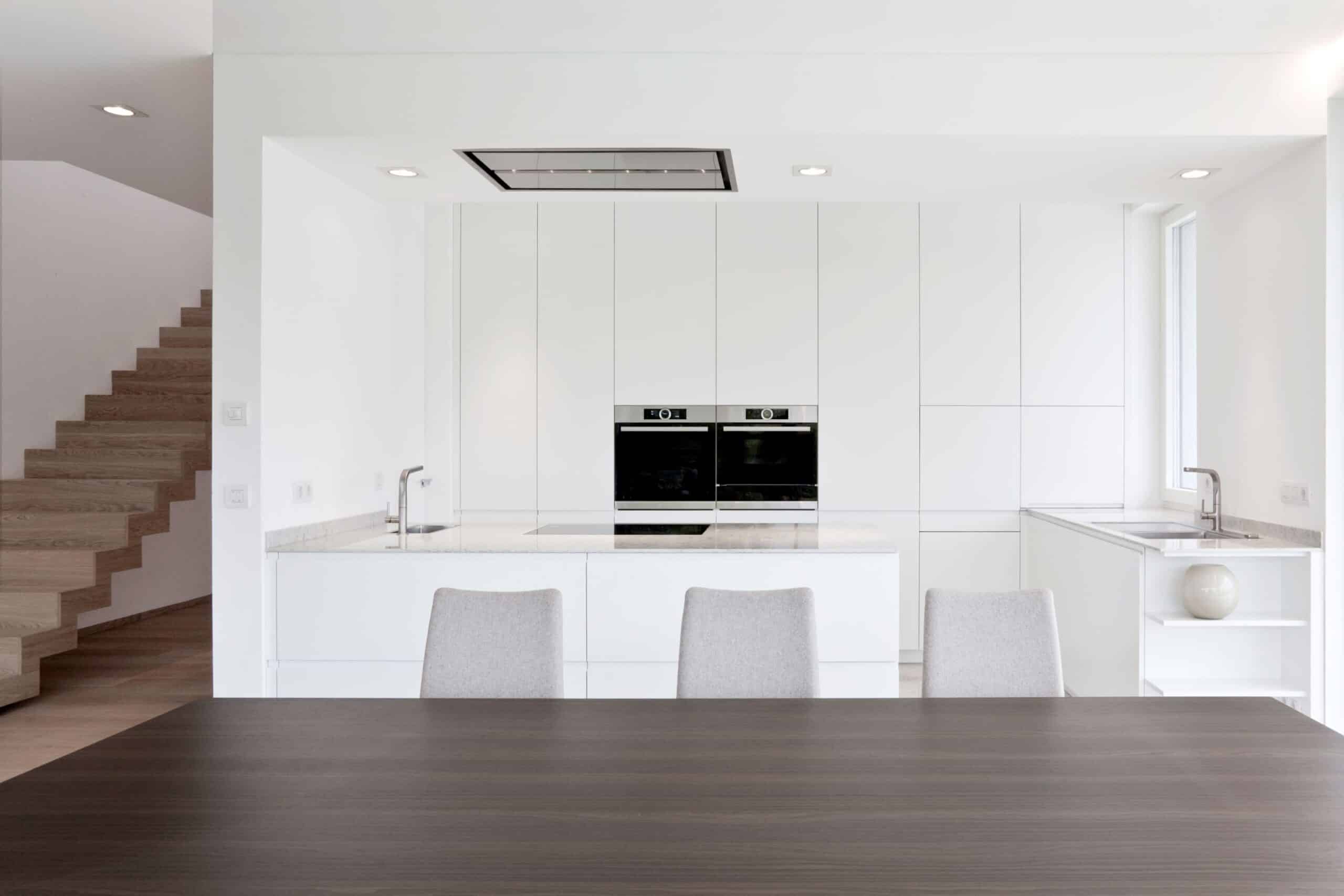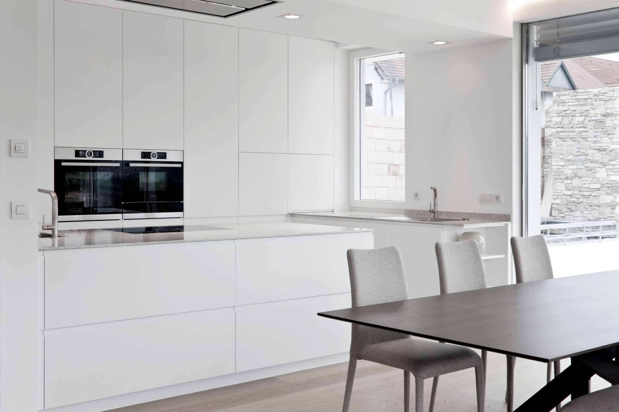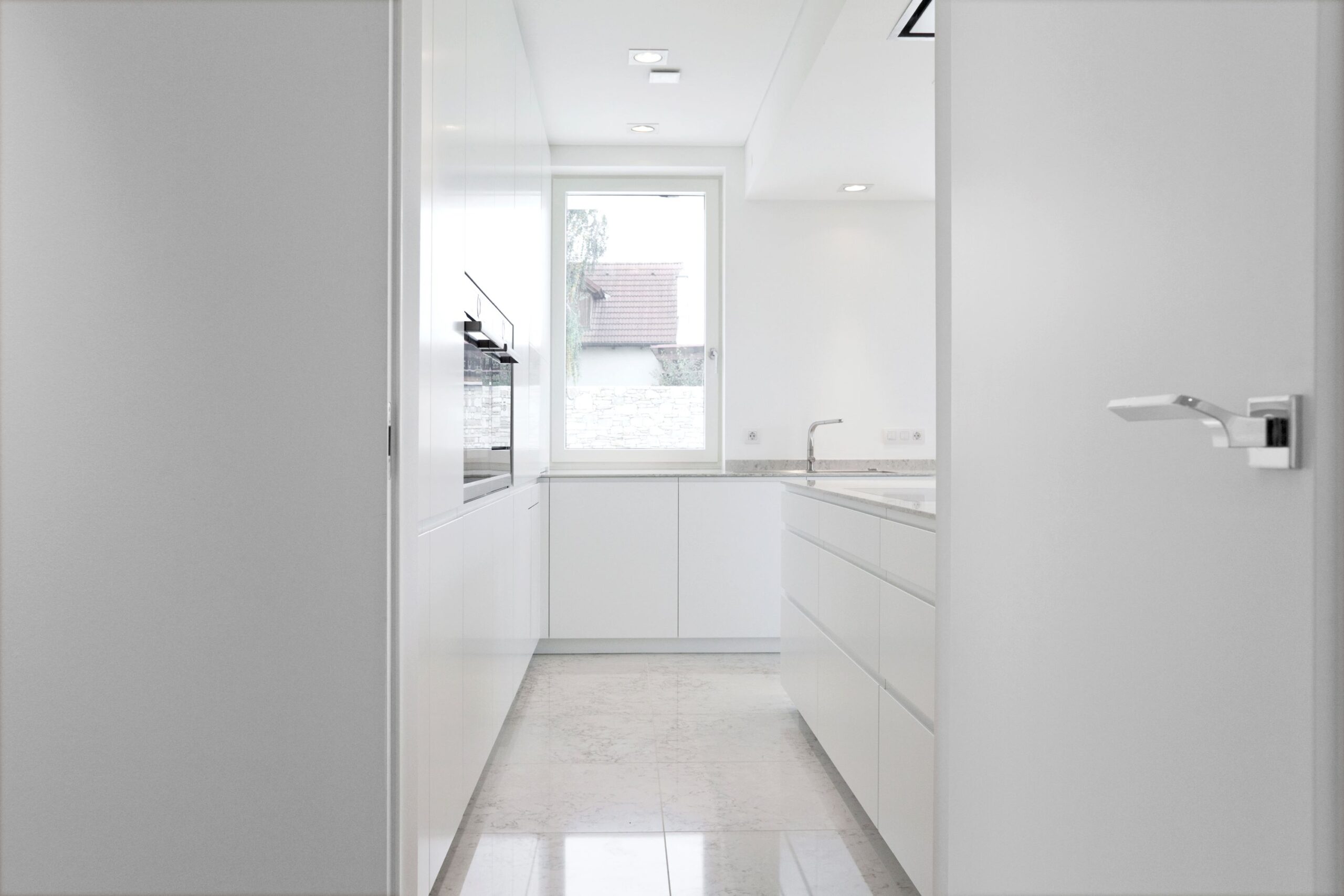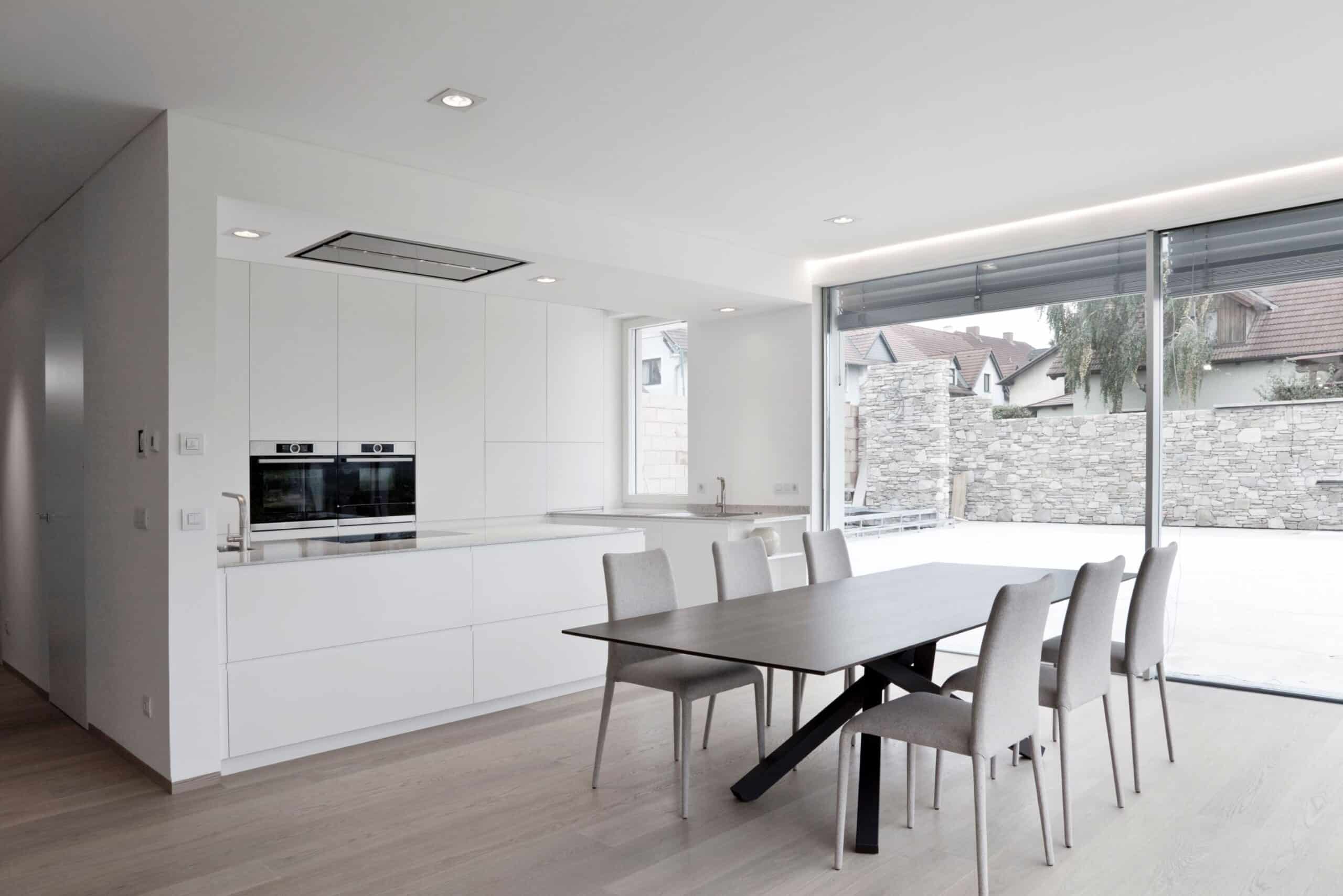 Das Herzstück des Neubaus ist die offene Küche, die als zentraler Treffpunkt des Hauses fungiert. Durch die Farbe Weiß strahlt sie Helligkeit und Reinheit aus und schafft eine offene und einladende Atmosphäre. Die Hochschränke wirken wie eine weiße Wand, um ein schlankes und unaufdringliches Erscheinungsbild zu erzielen.