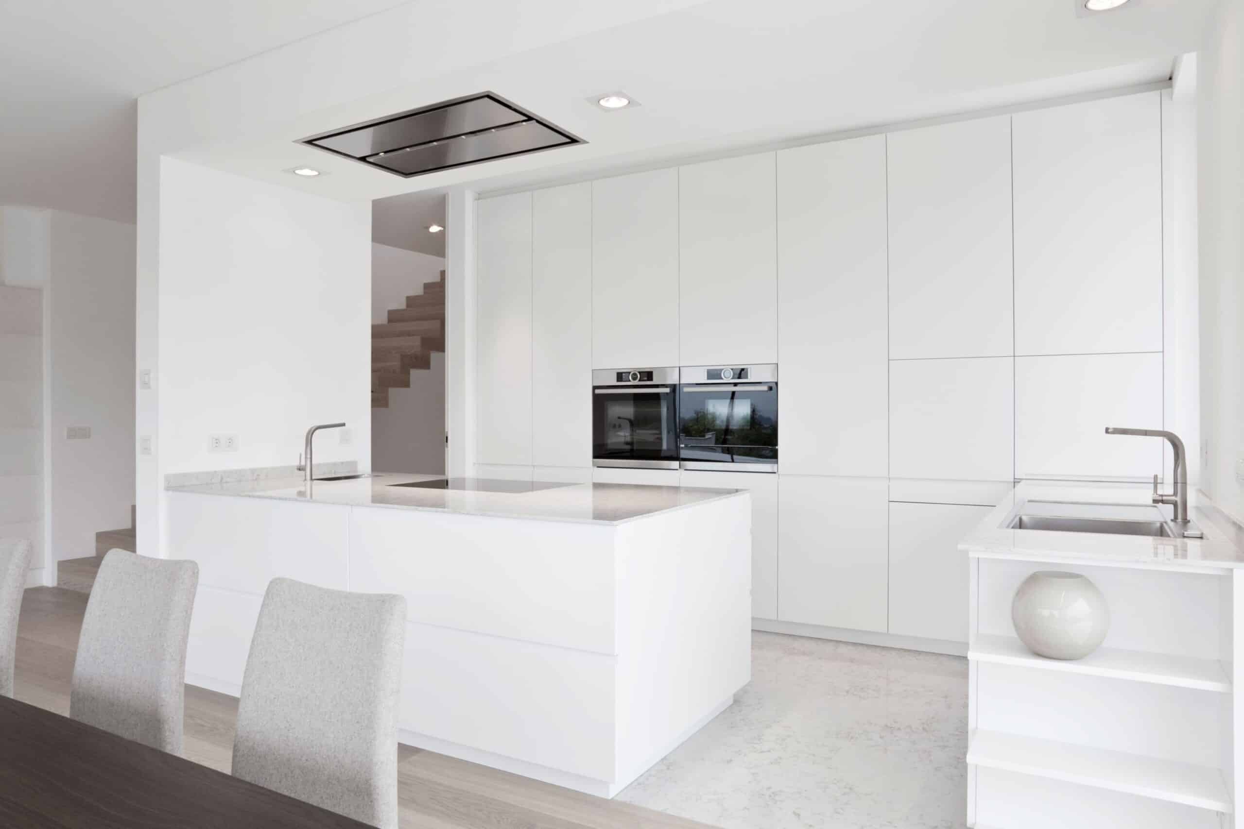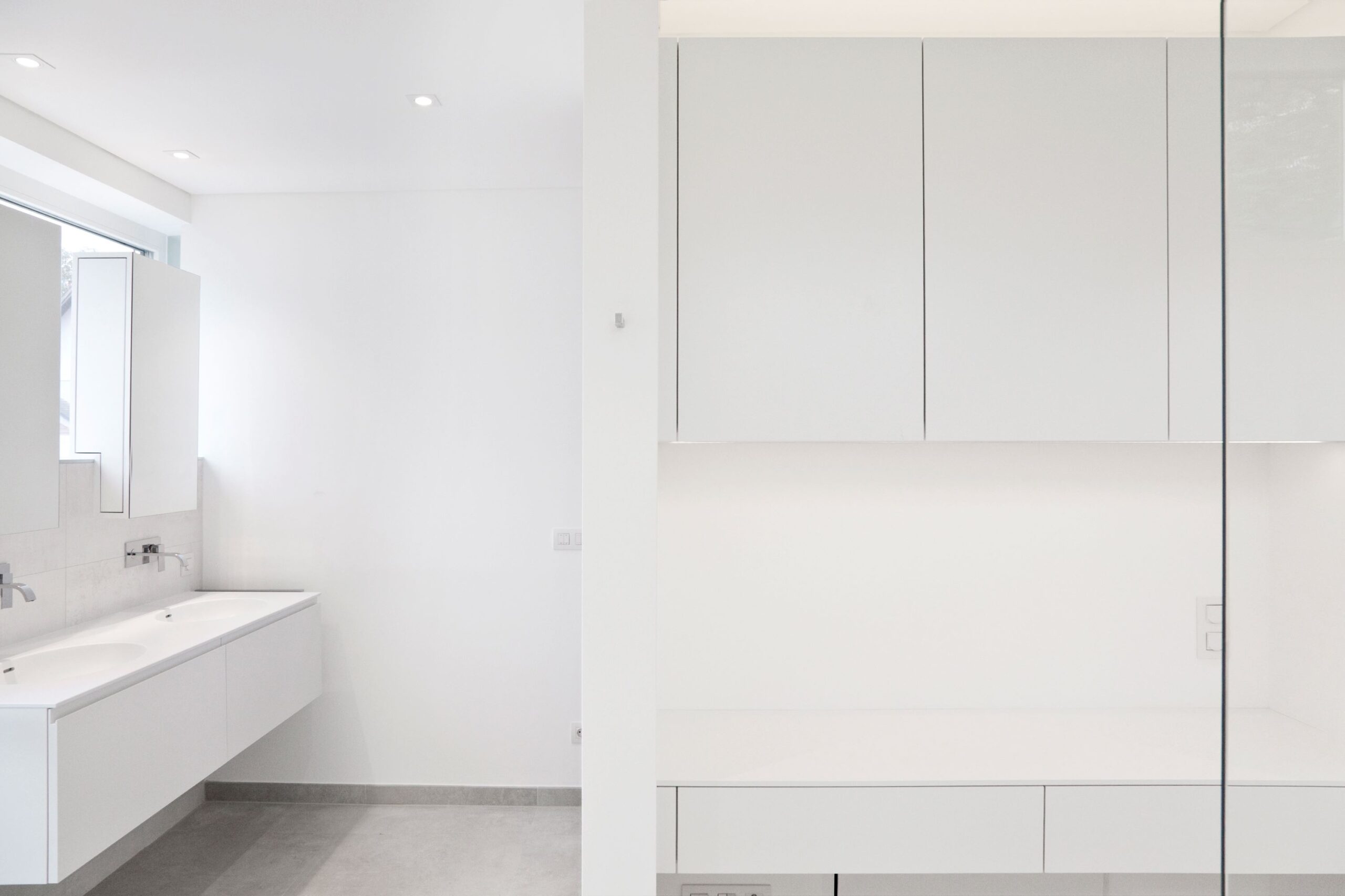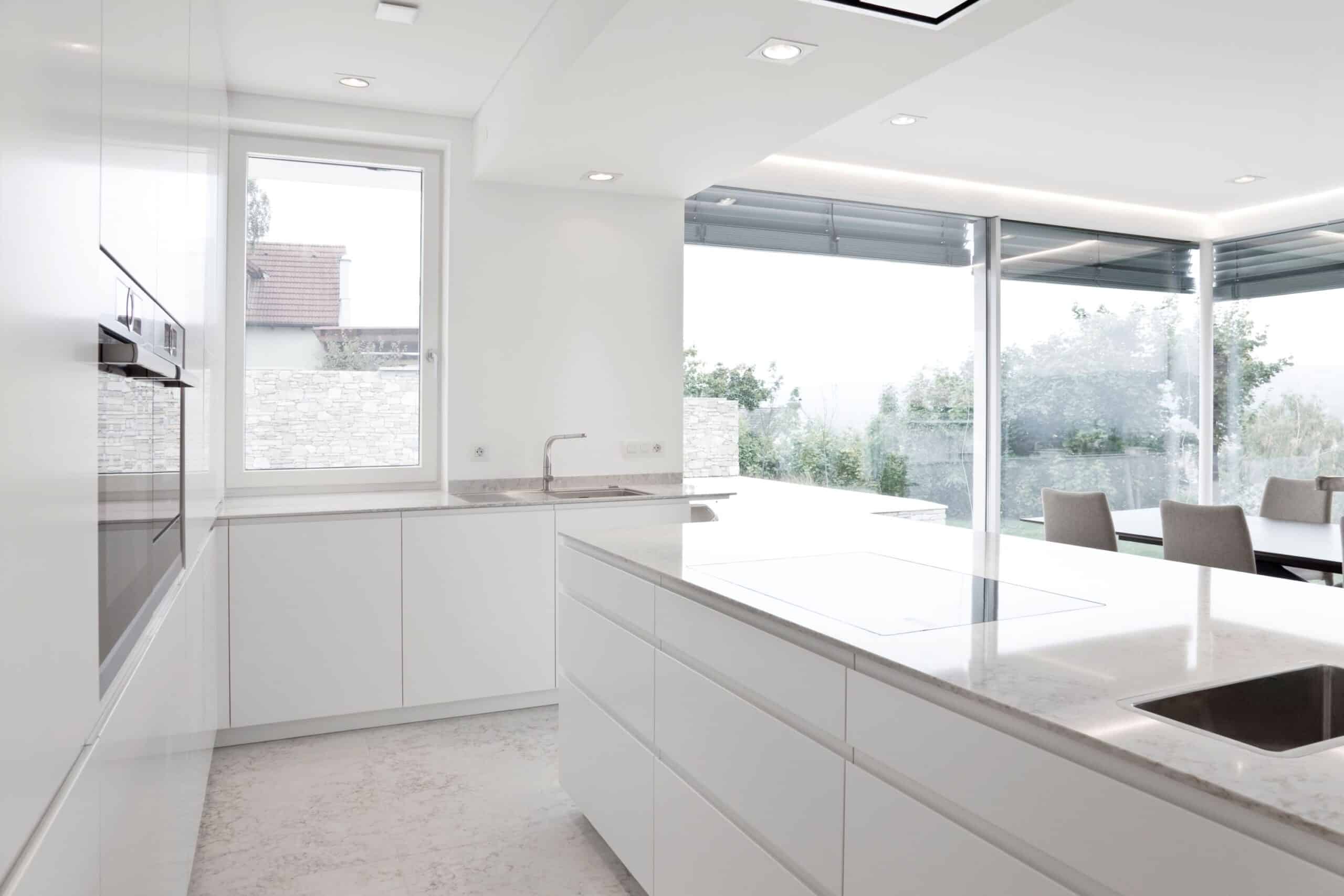 Das Herzstück des Neubaus ist die offene Küche, die als zentraler Treffpunkt des Hauses fungiert. Durch die Farbe Weiß strahlt sie Helligkeit und Reinheit aus und schafft eine offene und einladende Atmosphäre. Die Hochschränke wirken wie eine weiße Wand, um ein schlankes und unaufdringliches Erscheinungsbild zu erzielen.