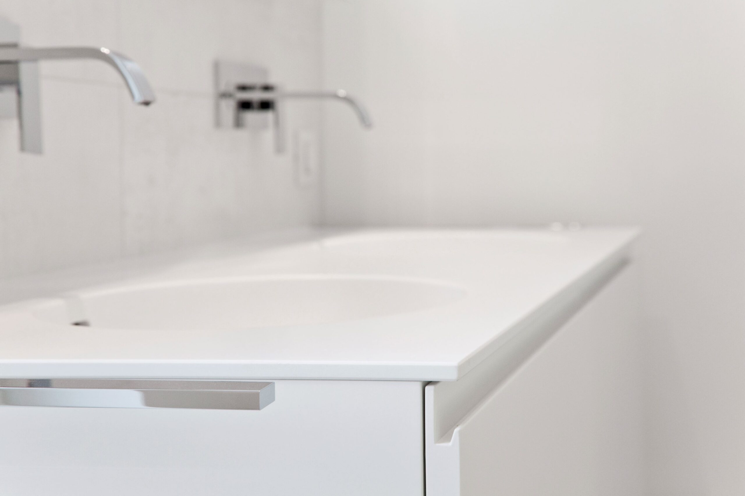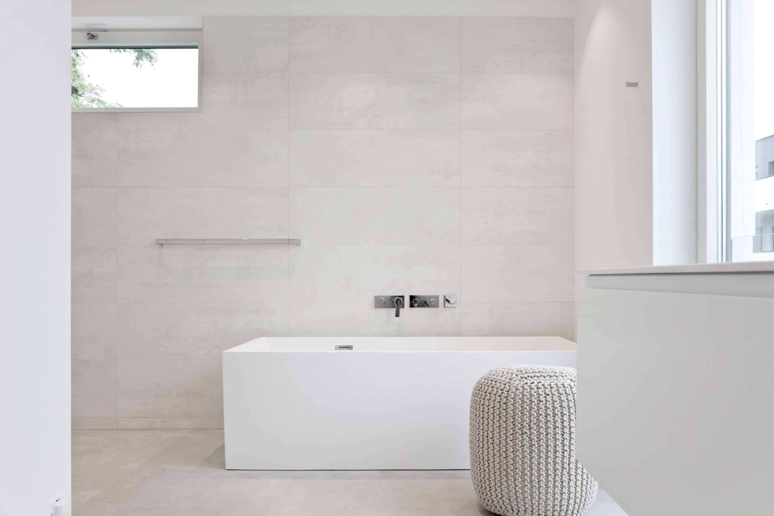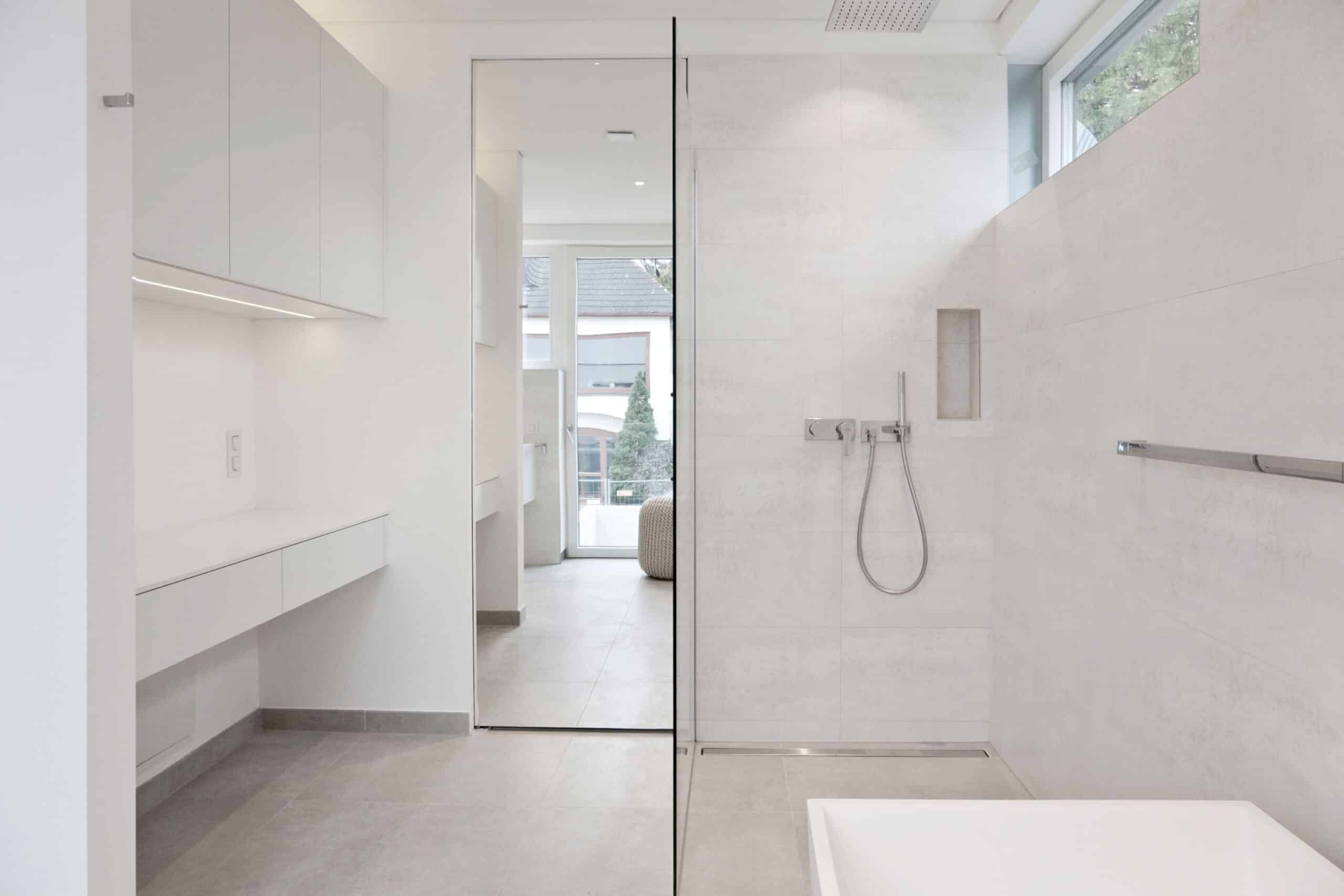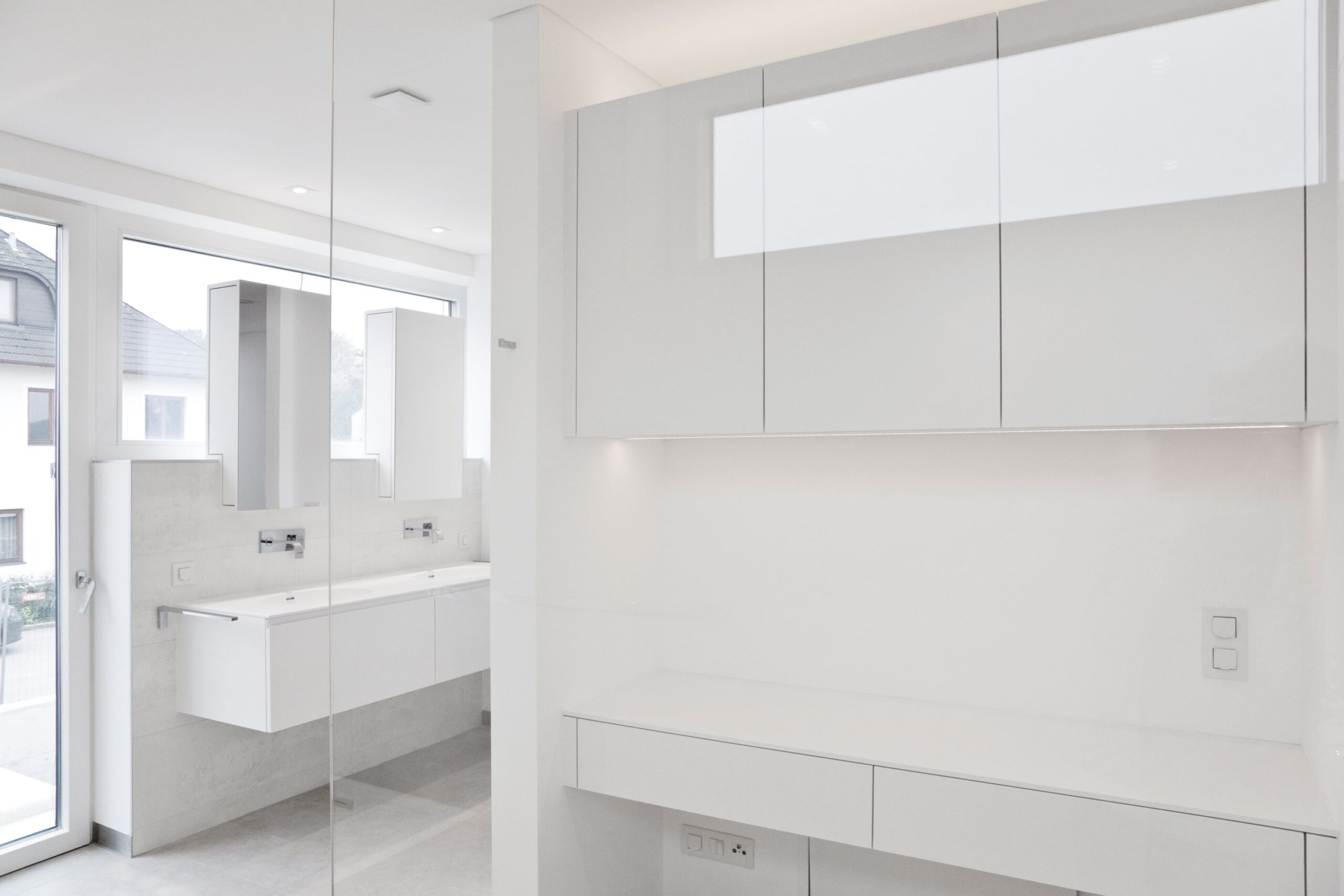 Das Herzstück des Neubaus ist die offene Küche, die als zentraler Treffpunkt des Hauses fungiert. Durch die Farbe Weiß strahlt sie Helligkeit und Reinheit aus und schafft eine offene und einladende Atmosphäre. Die Hochschränke wirken wie eine weiße Wand, um ein schlankes und unaufdringliches Erscheinungsbild zu erzielen.