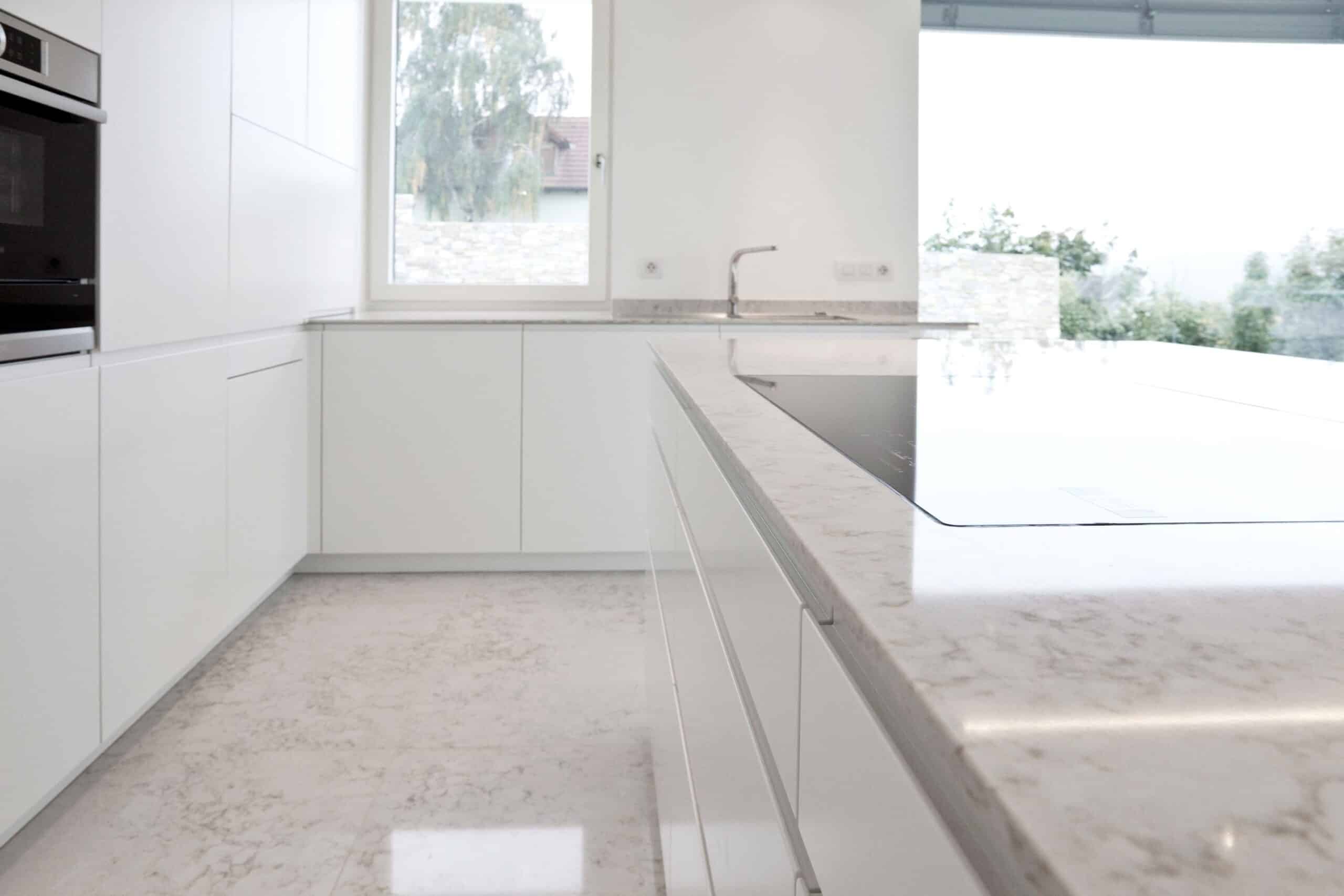 Die Kochinsel und der seitliche Arbeitsbereich ermöglichen das Zubereiten der Mahlzeiten in einem geschützten Bereich, ohne dabei auf den Ausblick in den Garten und das Überblicken des Wohn-/Essbereiches verzichten zu müssen.